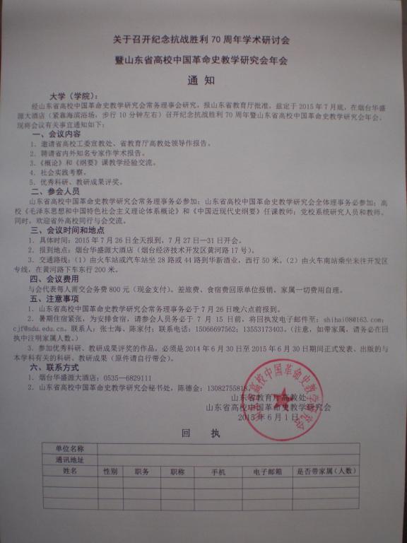 缁忓北涓滅渷楂樻牎涓浗闈╁懡鍙叉暀瀛︾爺绌朵細甯稿姟鐞嗕簨浼氱爺绌讹紝鎶ュ北涓滅渷鏁欒偛鍘呮壒鍑嗭紝鍏瑰畾浜�2015骞�7鏈堝簳锛屽湪鐑熷彴鍗庣洓婧愬ぇ閰掑簵鍙紑绾康鎶楁垬鑳滃埄70鍛ㄥ勾瀛︽湳鐮旇浼氭毃灞变笢鐪侀珮鏍′腑鍥介潻鍛藉彶鏁欏鐮旂┒浼氬勾浼氥備細璁氱煡濡備笅銆�