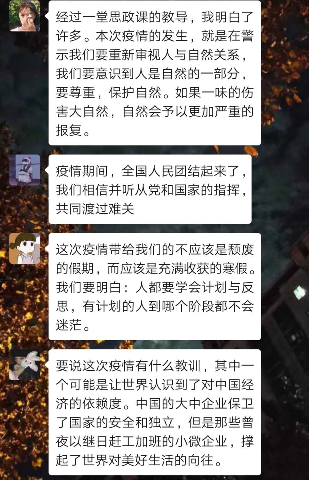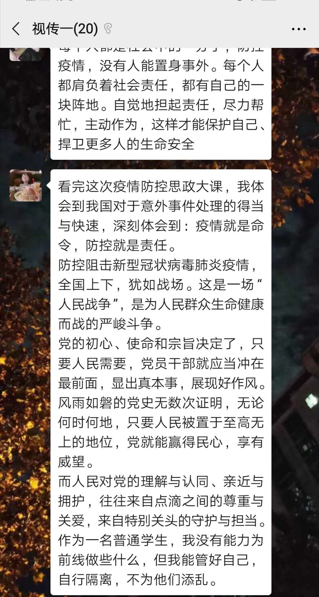 鍏ㄧ彮鍚屽20浜虹Н鏋佽鐪嬩簡浠婂ぉ鐨勭柅鎯呴槻鎺ф濇斂澶ц锛岀粨鏉熶箣鍚庡悓瀛︿滑鍦ㄧ彮绾у井淇$兢杩涜浜嗚璁猴紝澶у瀵硅嚜宸辫韩涓轰竴涓腑鍥戒汉鑰屾劅鍒拌崳骞搞傜柅鎯呭綋鍓嶏紝浜轰汉鏈夎矗銆傛垜浠鍓嶇嚎鎶楀嚮鐤儏鐨勫箍澶т竴绾垮尰鐤椾汉鍛樿〃绀哄磭楂樼殑鏁剰锛屼负鎶楀嚮鐤儏杩囩▼涓壓鐗茬殑鏃犳暟浠佷汉蹇楀+琛ㄨ揪鍝鎬濓紝瀵规湁鐞嗘兂銆佹湁鎷呭綋鐨勯潚骞翠滑鏁堟硶瀛︿範銆傜柅鎯呮湡闂达紝鎴戜滑瑕佷互澶у眬涓洪噸锛屾壙鎷呰捣涓涓ぇ瀛︾敓鐨勮矗浠汇傚緟鍦ㄥ閲岋紝鍚粠鍥藉瀹夋帓涓嶅鍑猴紝涓嶉棽閫涖傚湪瀹跺叧娉ㄧ柅鎯呭姩鎬侊紝缁欏浜哄浼犵煡璇嗭紝璁╀粬浠笉澶栧嚭銆傝繖鏄冮獙涓崕姘戞棌鐨勫喅鑳滄椂鍒伙紝鎴戜滑瑕佷弗鏍煎惉浠庣粍缁囧畨鎺掋傚悓鏃讹紝瀛︿範鐢熸椿涔熶笉鑳芥噲鎬狅紝鎴戜滑鏇村簲璇ヤ弗鏍艰姹傝嚜宸憋紝缁冨氨杩囩‖鏈锛屾垜涔熷笇鏈涙垜浠ュ悗鑳藉鎴愪负涓鍚嶆柊鏃朵唬鐨勯犵浜烘皯鐨勫ソ鍚屽織锛屼负绀句細鐨勫彂灞曚綔鍑鸿础鐚�!