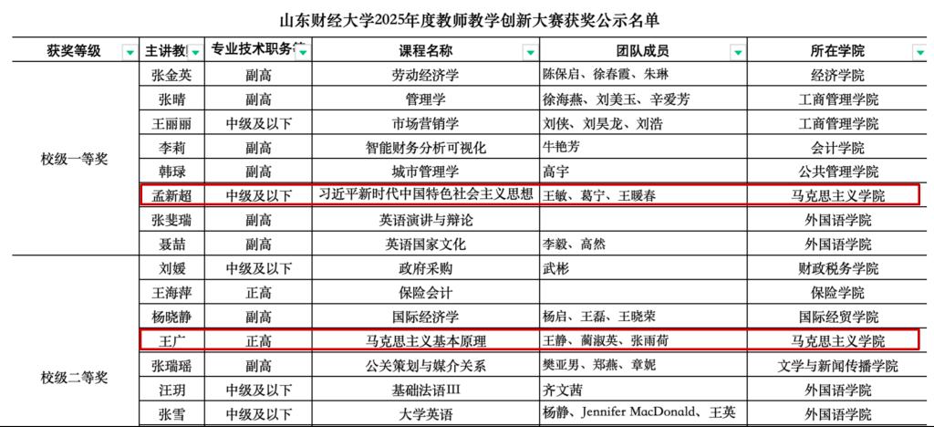 近日,山东财经大�2025年度教师教学创新大赛评选结果公布,我院教师斩获佳绩,孟新超荣获一等奖、王广荣获二等奖、刘东方荣获三等奖�