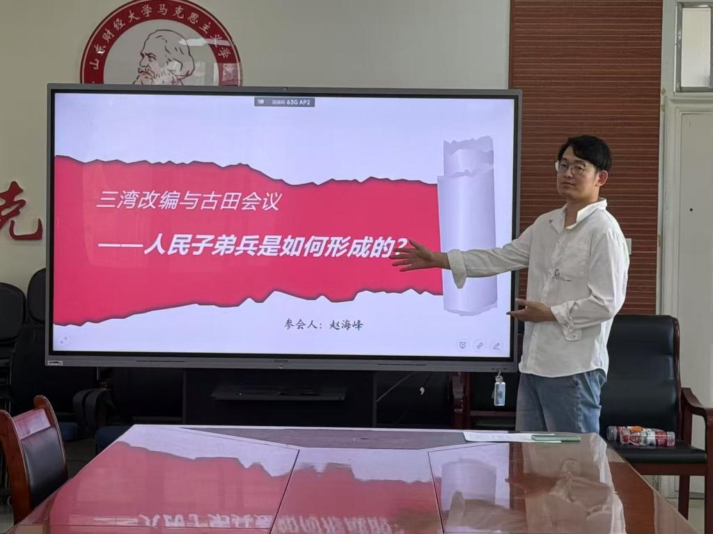 第二阶段开展教学展示与研讨环节。青年教师赵海峰博士以“三湾改编与古田会议—人民子弟兵是如何形成的”为主题进行教学展示。与会老师从教学设计、内容呈现、仪容教态等方面进行全面评议,提出优化建议:教学选题需增强问题意识,主题阐释应强化逻辑关联;课件制作宜采用结构化呈现,重点内容需视觉强化;教学语言应追求精准凝练,案例选取须兼顾学理深度与现实观照;教师教态需展现思政课教师特有的理论自信与教学风采�