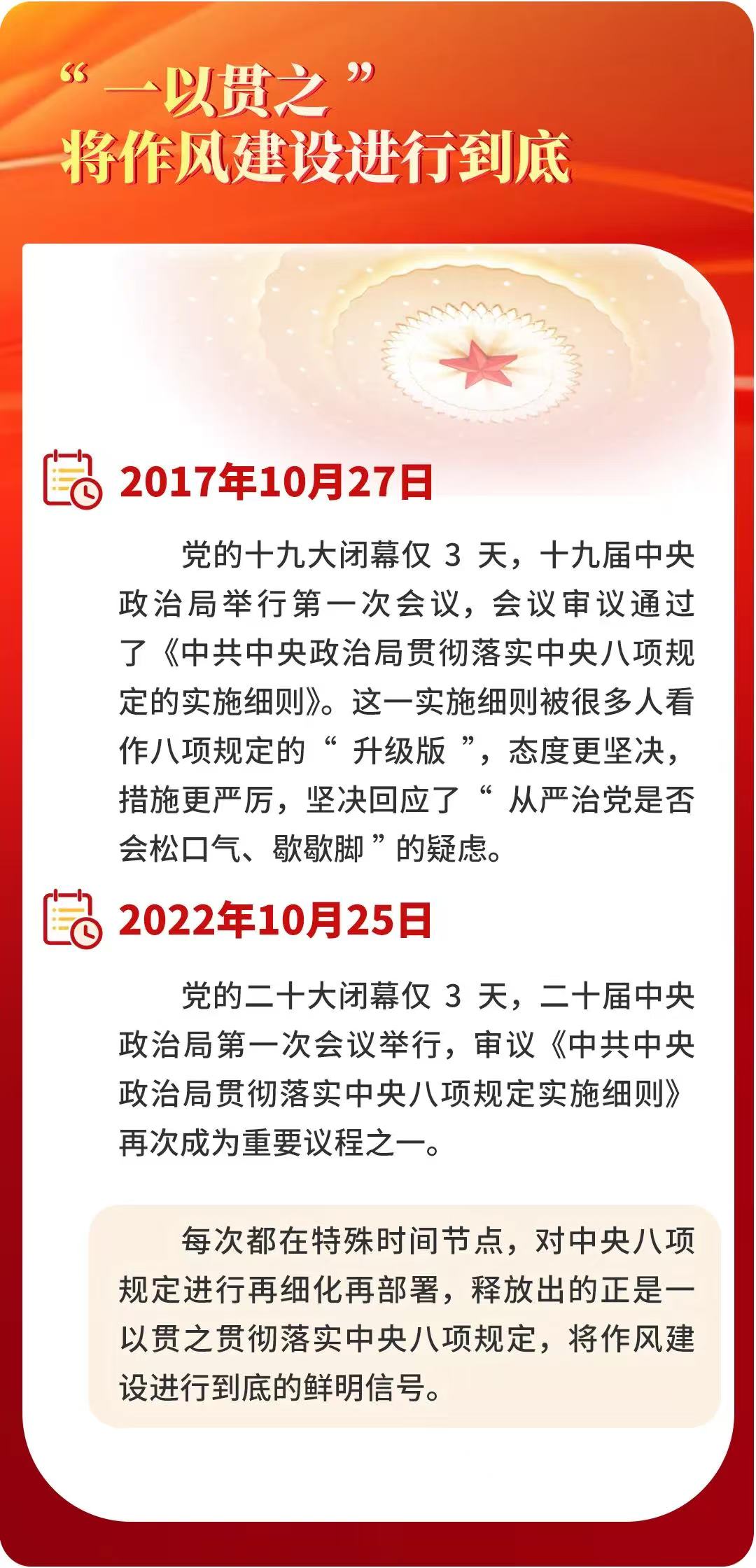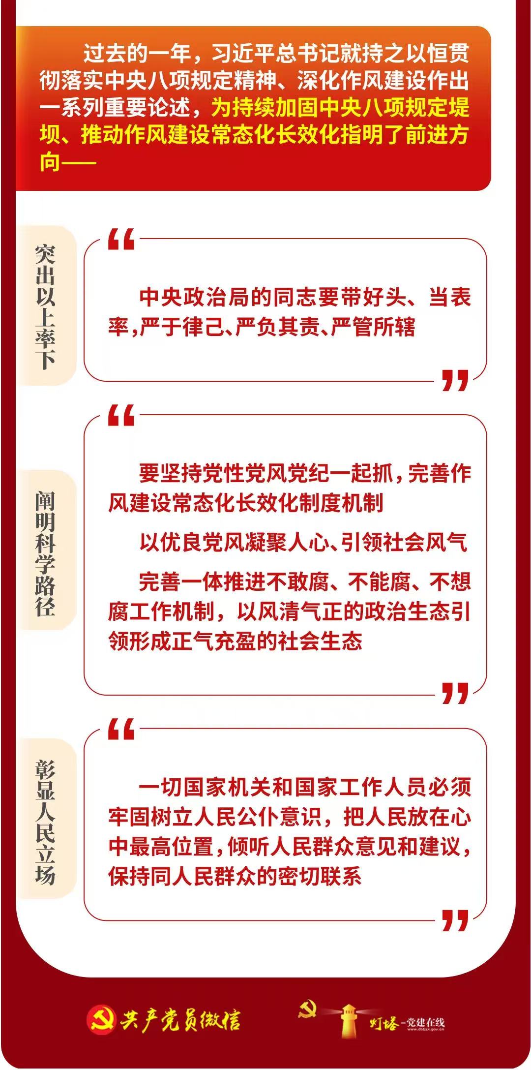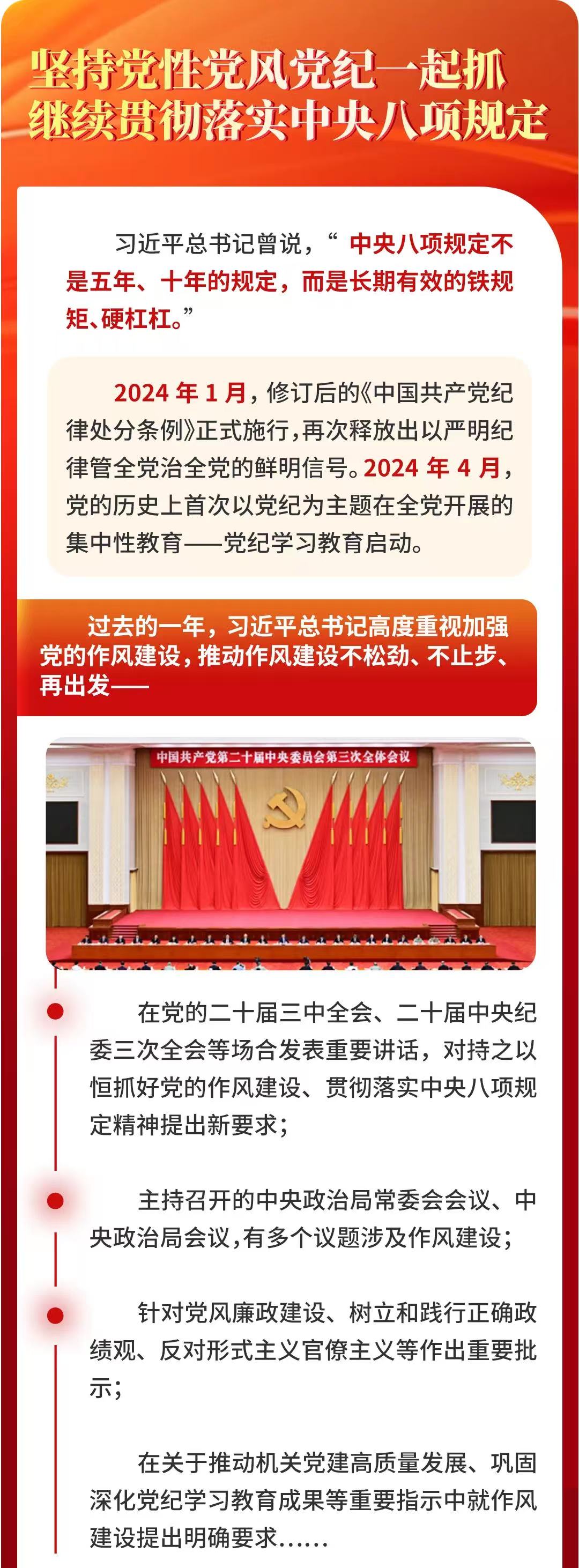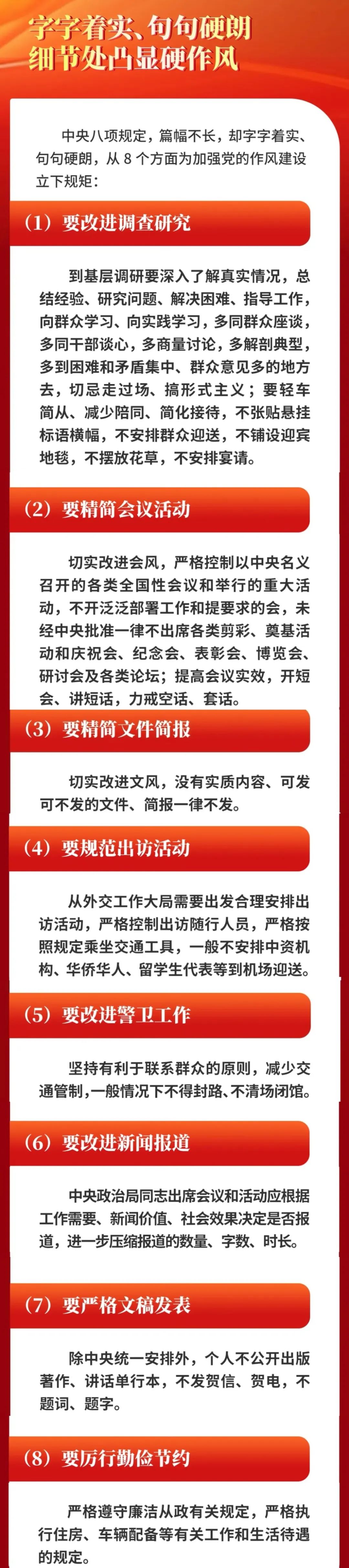在二十届中央纪委四次全会上,习近平总书记强调:“把中央八项规定作为铁规矩、硬杠杠,严肃查处顶风违纪、隐形变异的‘四风’问题,督促党员、干部坚决反对特权思想和特权现象,树牢正确权力观、政绩观、事业观。”中央八项规定,短短600余字,涉及改进调查研究、精简会议活动等多方面。自出台以来,中央八项规定带来的党风政风社风民风变化,深刻影响和改变着中国,成为新时代中国共产党作风建设的“金色名片”�