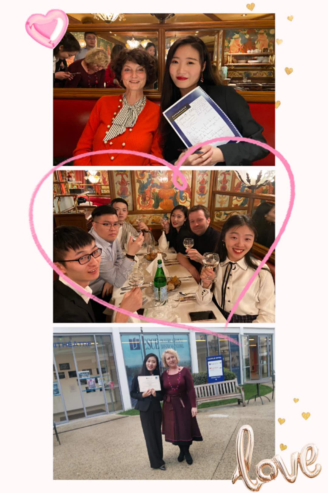 离开法国前的晚上,ESCE邀请本次项目全体授课教师和30名访学研究生在著名的“猪脚”餐厅共进晚餐,在浪漫的巴黎,吃着浪漫的法餐,讨论着三个月所经历的点点滴滴,感叹着时间消逝的速度,我们在欢声笑语中互相拥抱,请老师在纪念册下写下寄语与签名,一切都在告诉我们,要结束了。在一声声“Au revoir!”中,目送老师们陆续离开,天下没有不散的筵席,这一切会一直留在心底�