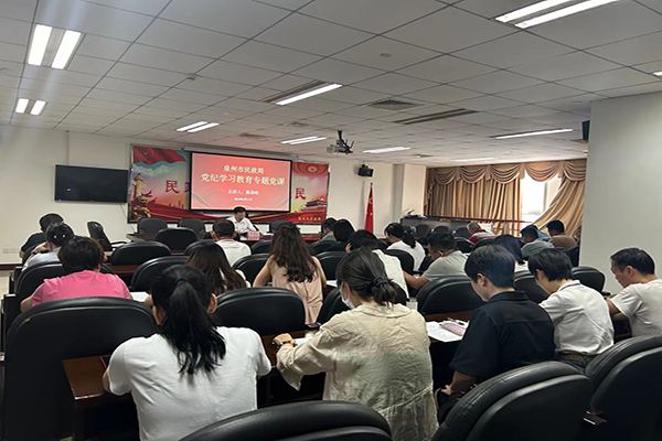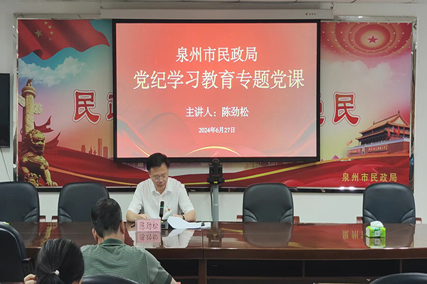 为推动党纪学习教育走深走实,6月27日下午,市民政局党组书记、局长陈劲松以“扎实开展党纪学习教育 护航泉州民政事业行稳致远”为主题,为民政系统党员干部讲专题党课。