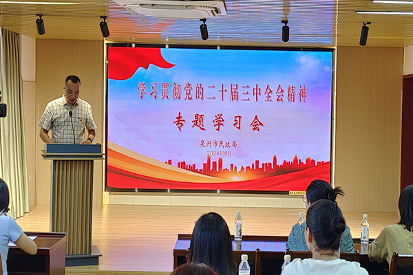 会议强调,一要深入学习领会全会精神,把学习贯彻全会精神作为当前和今后一个时期的一项重大政治任务,深刻领会新时代全面深化改革取得的历史性伟大成就,以实际行动坚定拥护“两个确立”、坚决做到“两个维护”。二要统一思想、凝聚共识,把思想和行动统一到党中央决策部署上来,把改革精神、改革思维、改革方法贯穿民政各项工作全过程,蹄疾步稳全面深化民政改革。三要落实好全会关于民政领域的改革部署,立足泉州实际,把贯彻落实全会部署要求同谋划部署未来一个时期民政工作、科学编制“十五五”民政事业发展规划及有关专项规划、抓好养老服务和社会救助等重点领域改革创新、推进下半年民政领域各项工作结合起来,推动民政事业全方位高质量发展。
